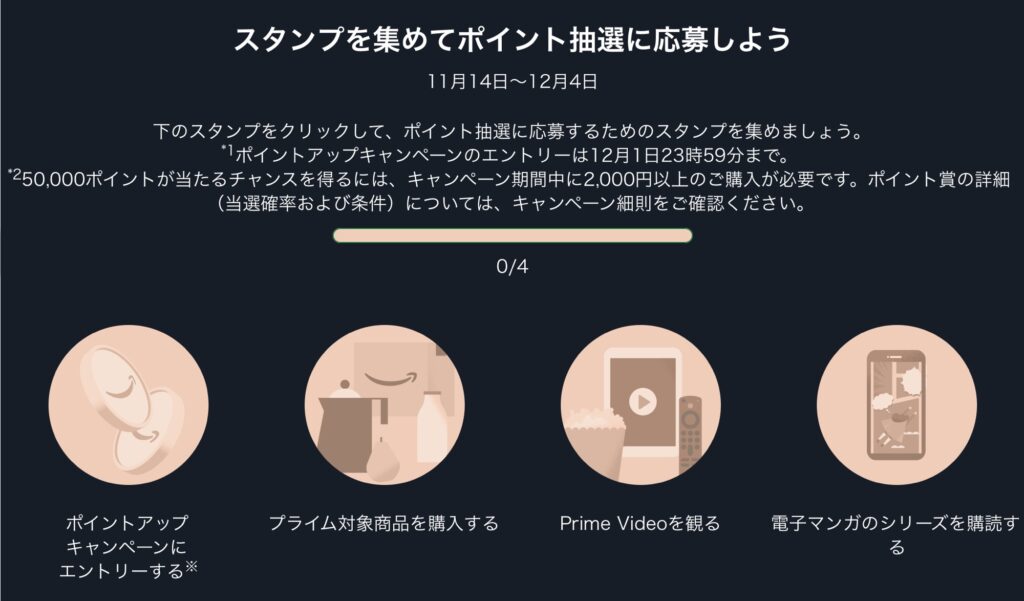 プライム会員の方の場合はスタンプラリーに参加することで最大50000ポイントが抽選で当たります。