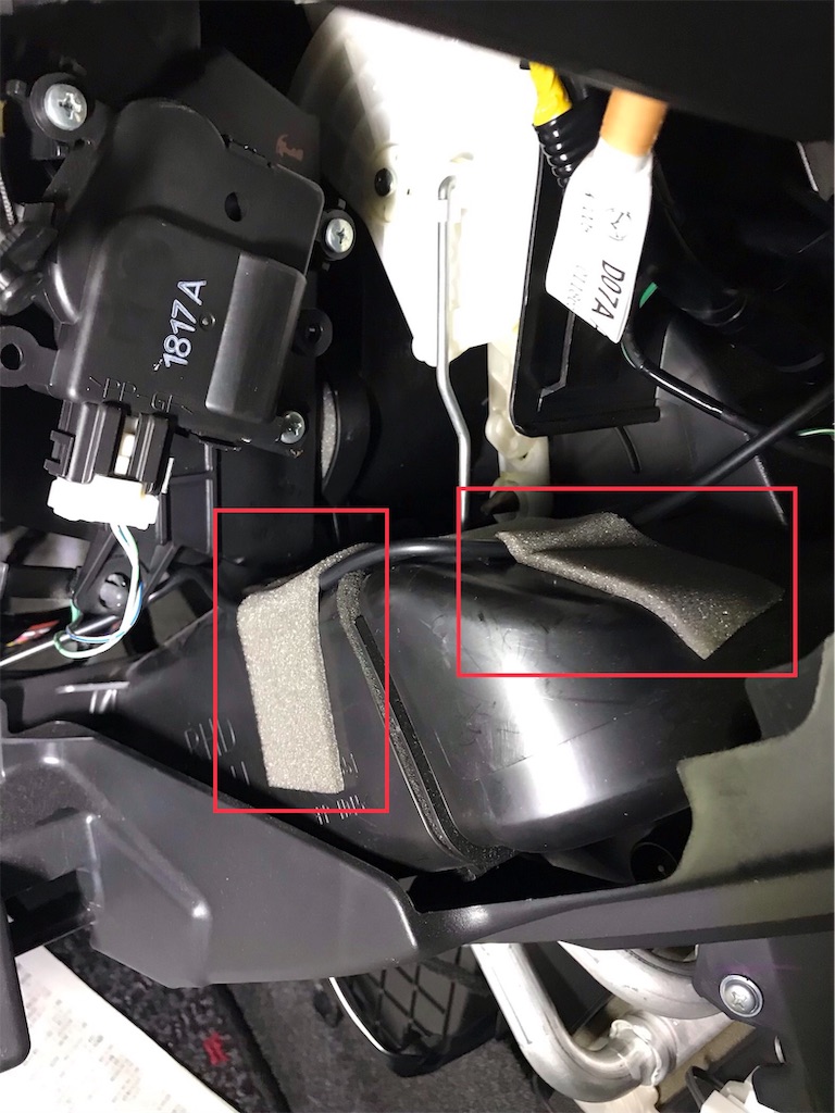 ナビ裏からグローブボックスの奥、助手席側Aピラー(フロントガラスの横の柱)